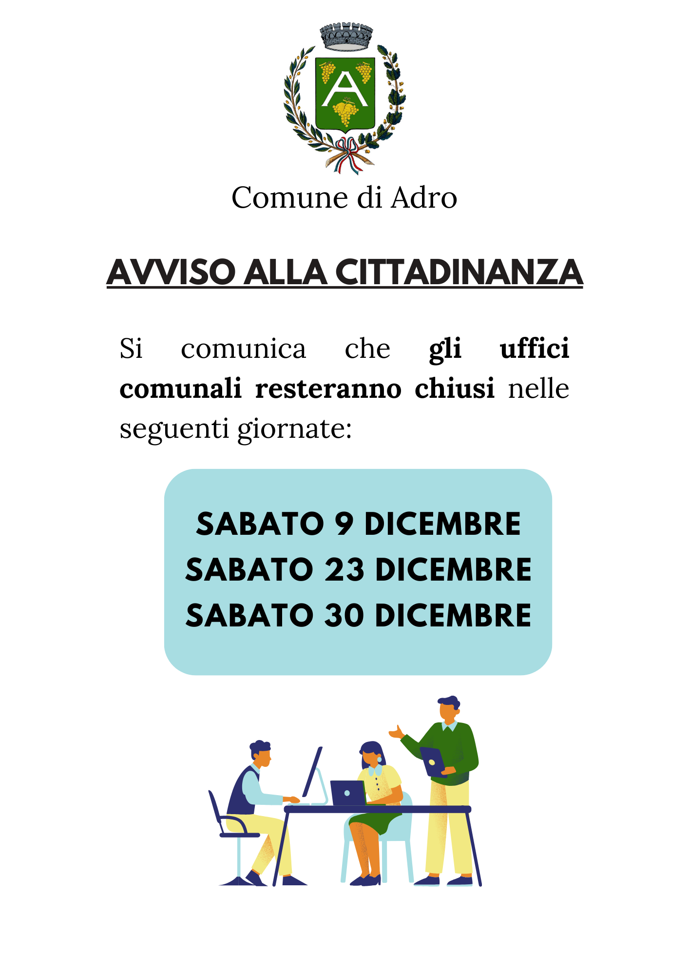 Chiusura uffici comunali sabato 9, 23 e 30 dicembre