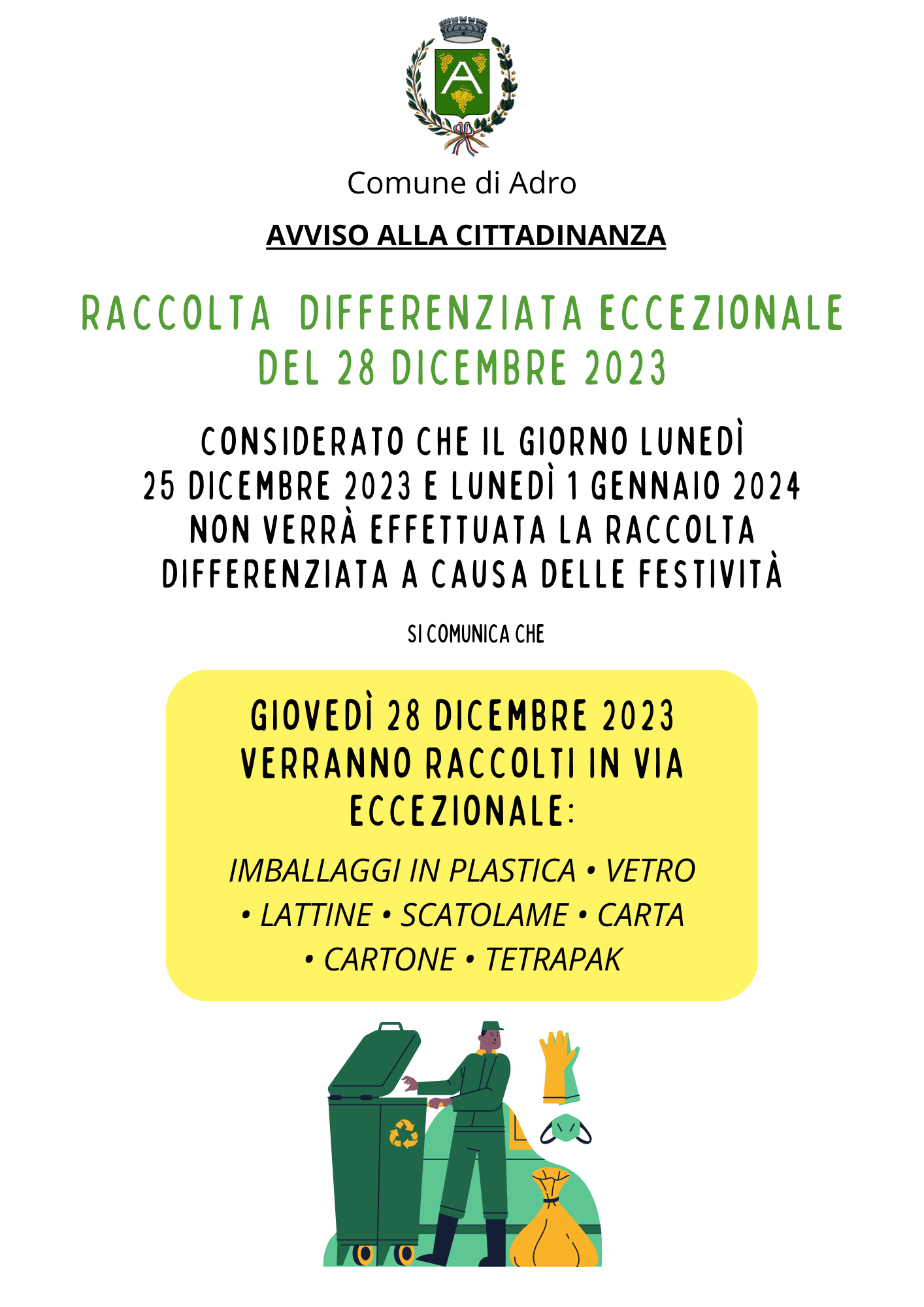 Considerato che il giorno lunedì 25 dicembre 2023 e lunedì 1 gennaio 2023 non verrà effettuata la raccolta differenziata a causa delle festività, si comunica che giovedì 28 dicembre 2023 verranno raccolti in via eccezionale: Imballaggi in plastica, Vetro, Lattine, Scatolame, Carta, Cartone e Tetrapak.