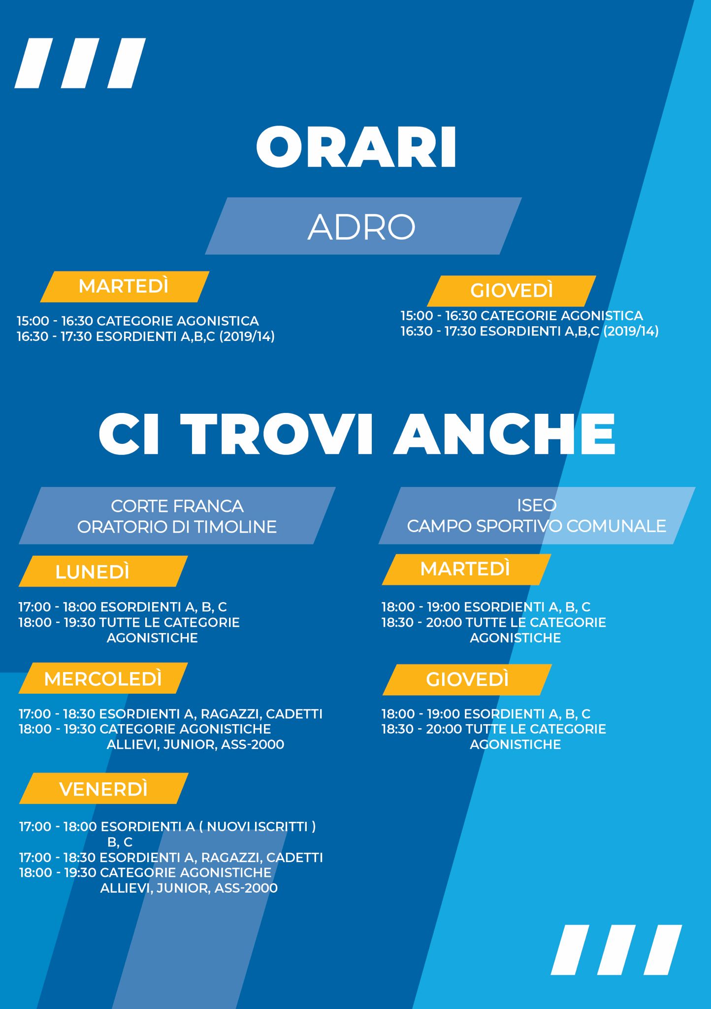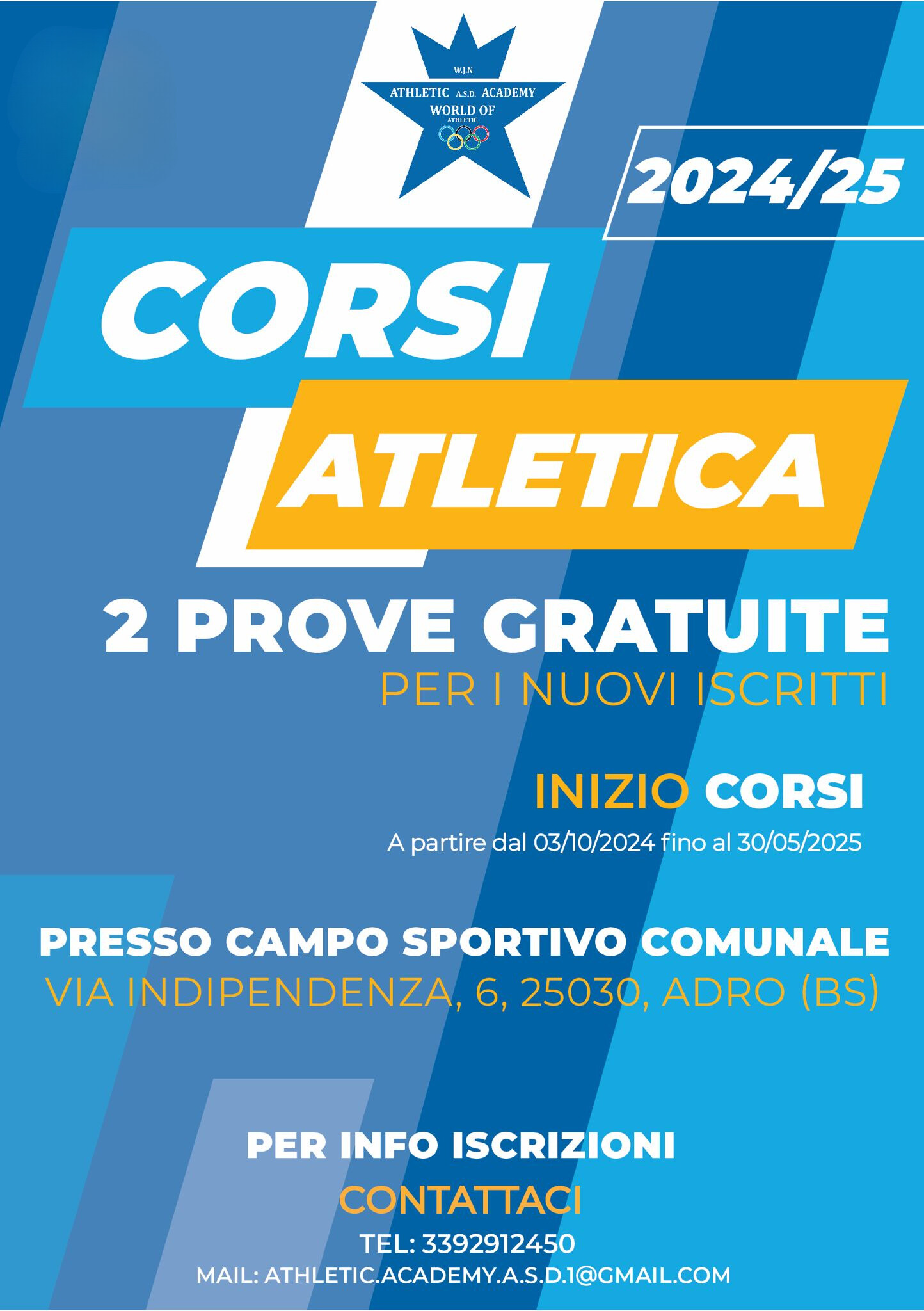 Nei Comuni di Adro, Corte Franca e Iseo sono stati organizzati dei corsi di atletica per la cittadinanza, attivi a partire dal 03/10/2024 al 30/05/2025. In particolare, i corsi di Adro si svolgeranno presso il Campo Sportivo Comunale, ogni martedì e giovedì, e saranno divisi in tal modo: